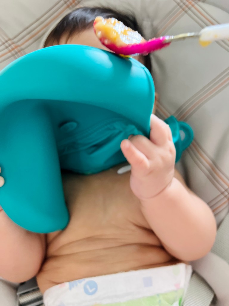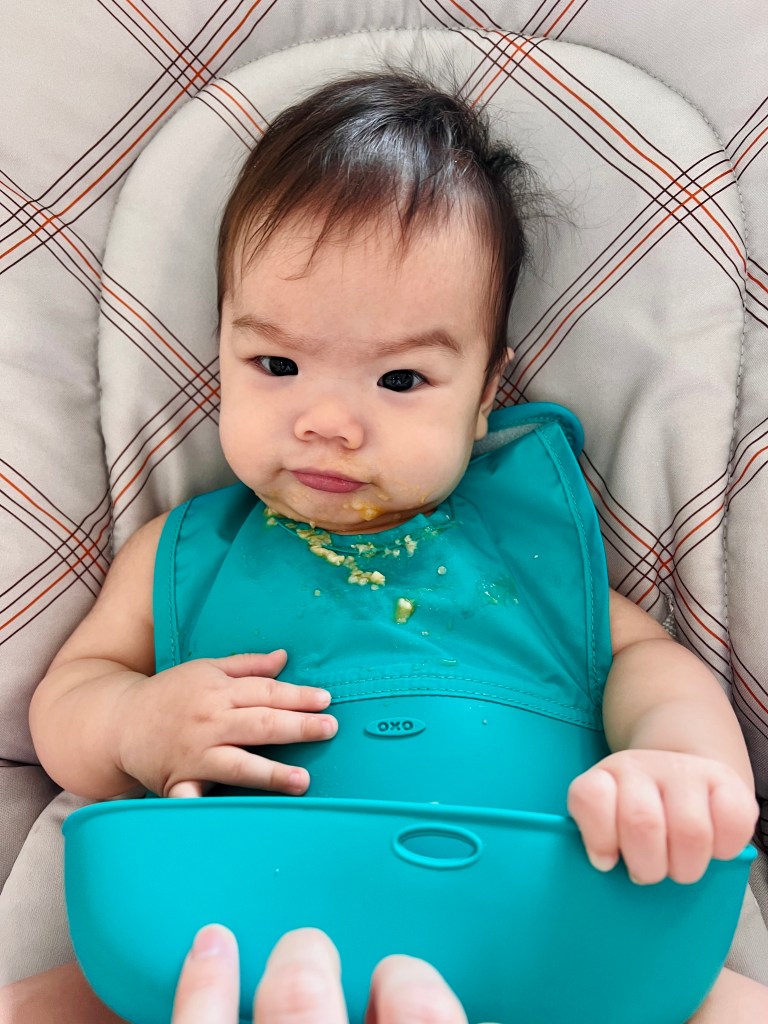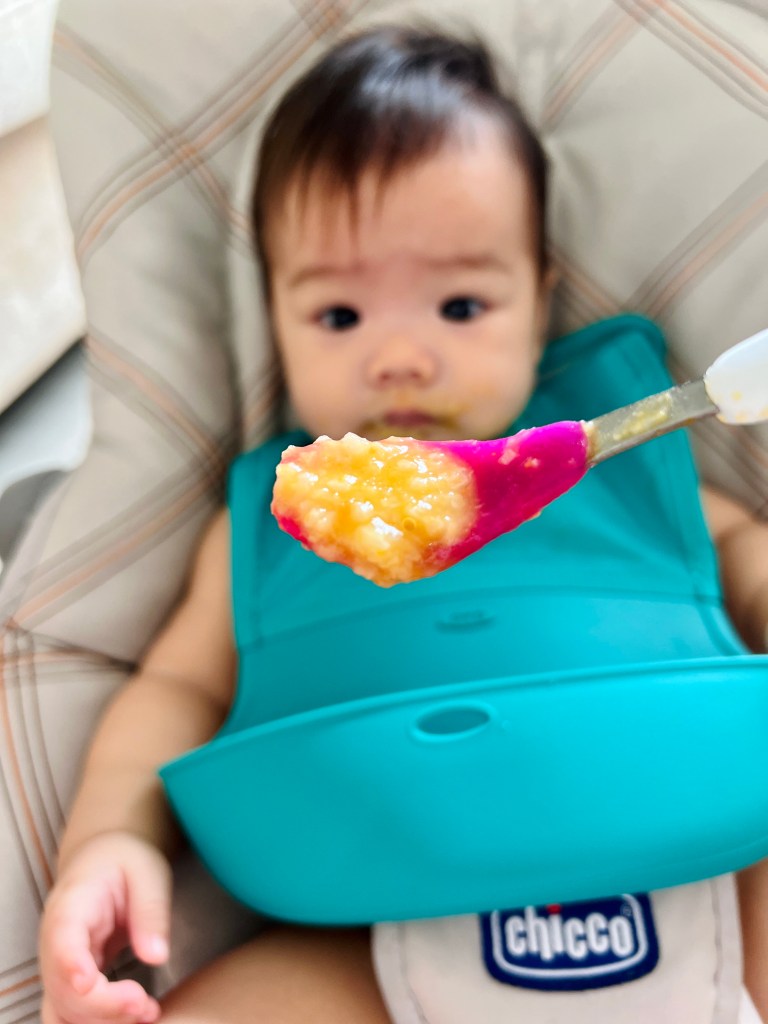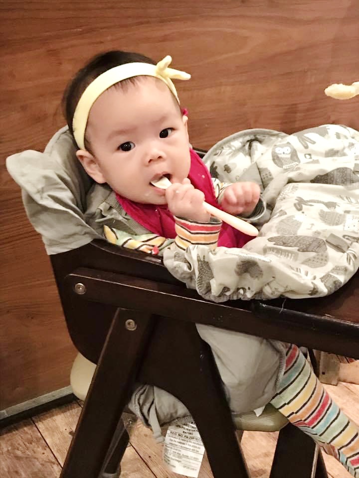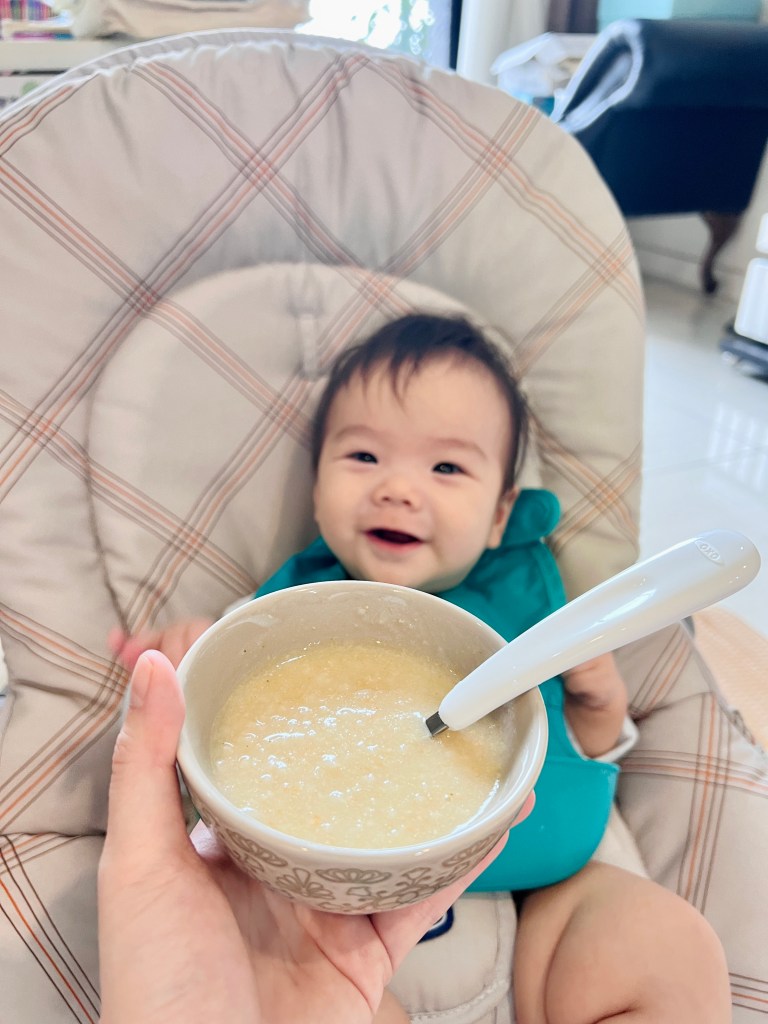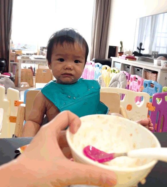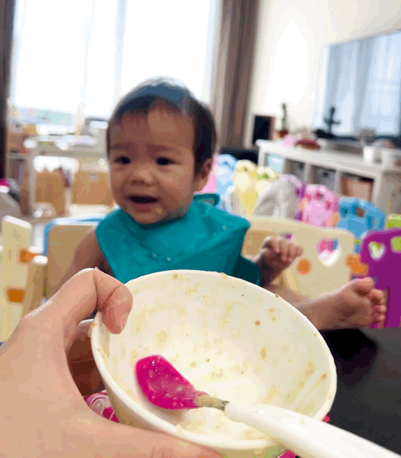 小少爺和姐姐一樣長牙長得很慢,但仍然可以用牙齦磨,學會吞咽,五倍粥濃度不會太軟爛也不會太乾吞不下去,我覺得很剛好。