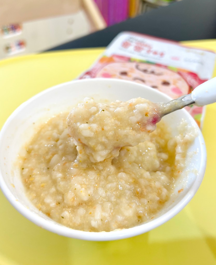 她八個月大回台灣,實在懶得在娘家煮,預先上網訂了一箱農純鄉寶寶粥,加熱完滿室生香,蚌殻精也願意多吃幾口,還能常溫保存,我又訂了二箱扛回大馬。