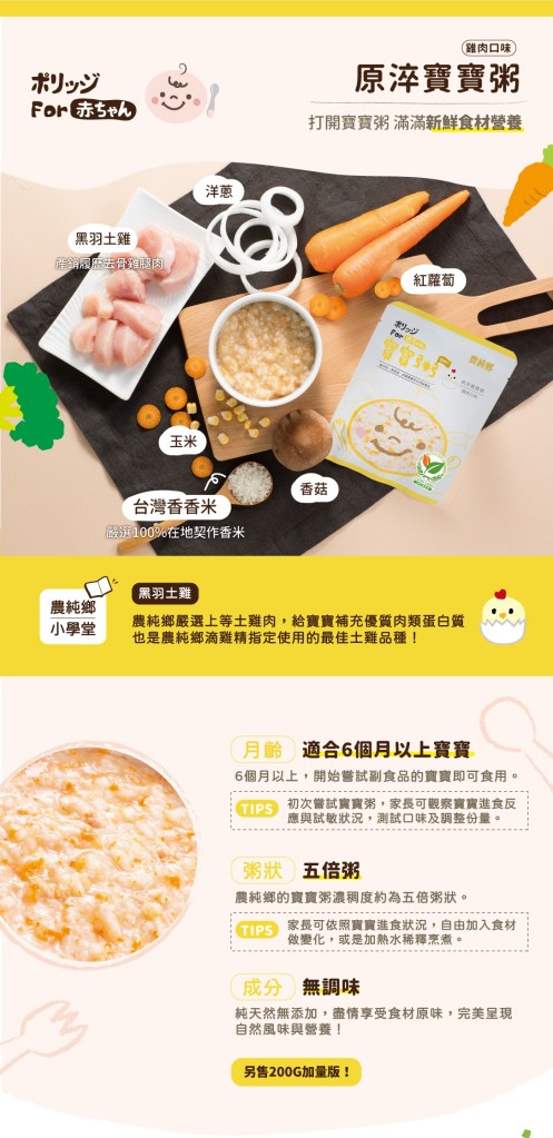 原淬寶寶粥:黑羽土雞、水、台灣香米、洋蔥、紅蘿蔔、玉米、香菇