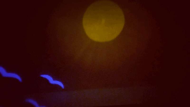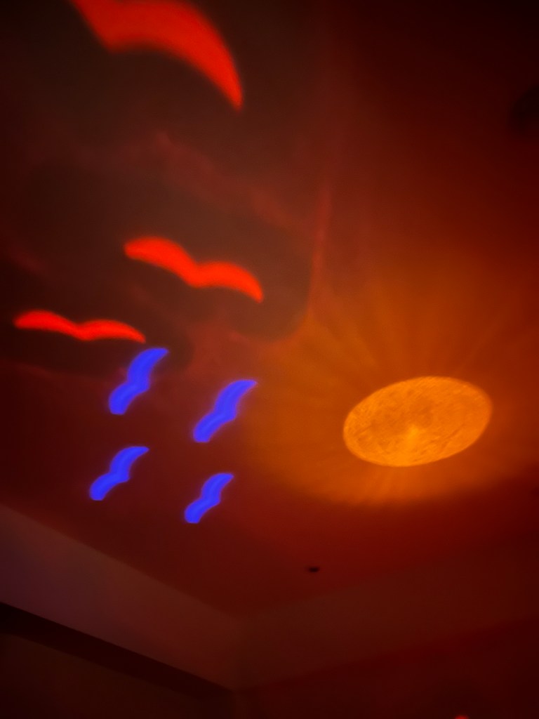 投影出飛翔的歸巢鳥兒及夕陽天空,圖案會不停變化,顏色真的很漂亮!我一個大人都好喜歡!