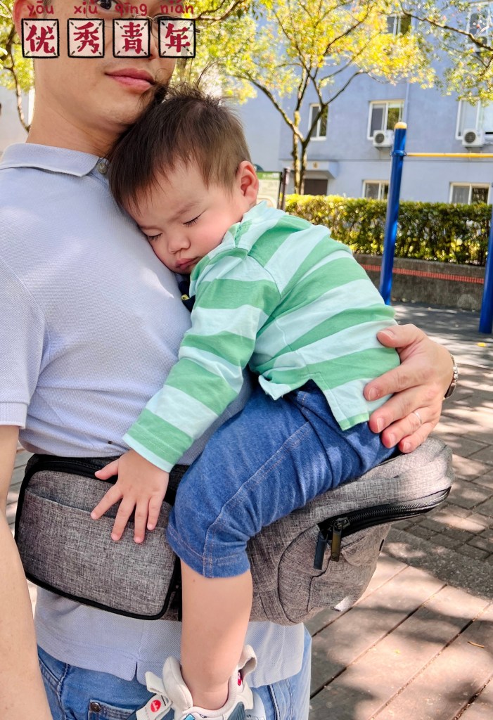 全身揹巾比較悶熱,相比之下腰凳就清爽俐落多了,特別適合怕熱的父母和孩子,小少爺常常坐著坐著就睡著了,而且可以睡很久不會滿頭大汗地醒過來。