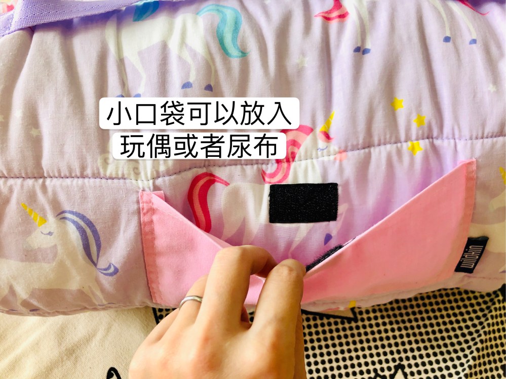 前方有個小口袋可以放入陪睡玩偶或者尿布。