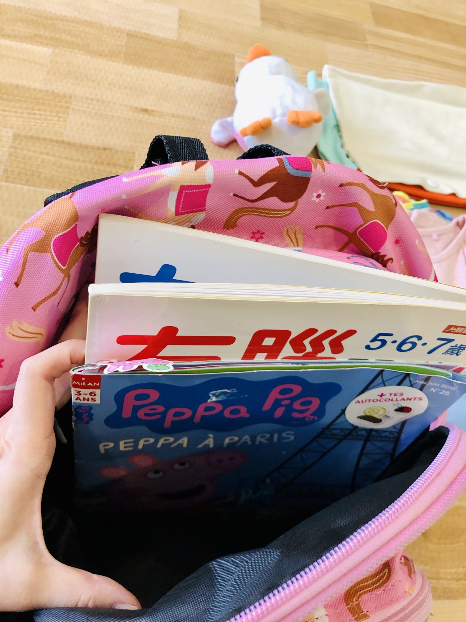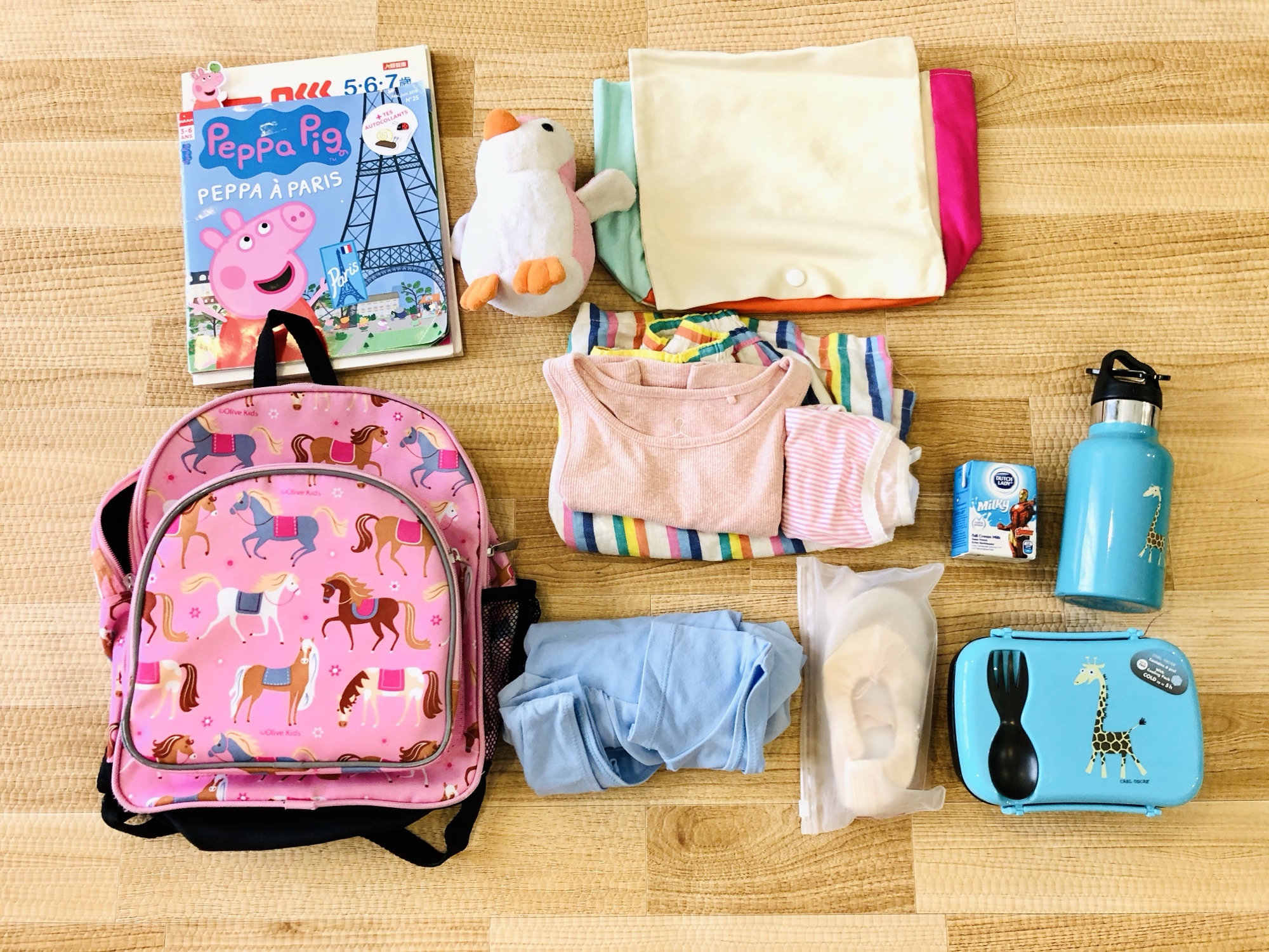 換洗衣物,上芭蕾舞課的衣服鞋子,陪伴娃娃,點心盒和牛奶,水壺通通都放進去。
