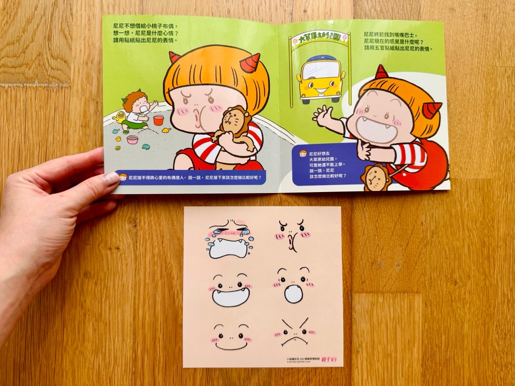 圖卡中提供不同的情境狀況,讓孩子選擇適當表達貼在尼尼的臉上,說出感受及解決方法。
